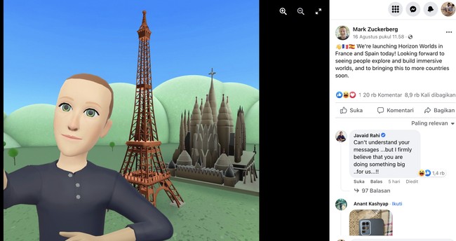 "Update besar pada Horizon (platform metaverse Meta-red) dan grafis avatar segera datang. Aku akan membagikan lebih banyak," tulisnya.