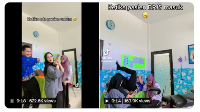 Diketahui postingan tersebut mulanya diunggah akun TikTok @rintobelike2, ada dua video yang buat. Pertama video menampilkan Nakes joget-joget kegirangan ketika pasien umum masuk.