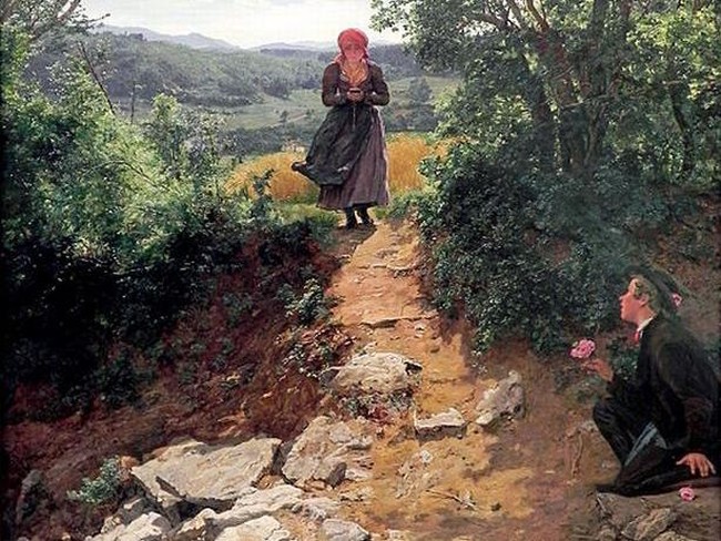 Lukisan ini berjudul 'The Expecteed One' karya Ferdinand George Waldmüller yang dibuat pada tahun 1860-an dan memperlihatkan seorang wanita tengah berjalan di sebuah pedesaan dengan pemandangan yang indah.