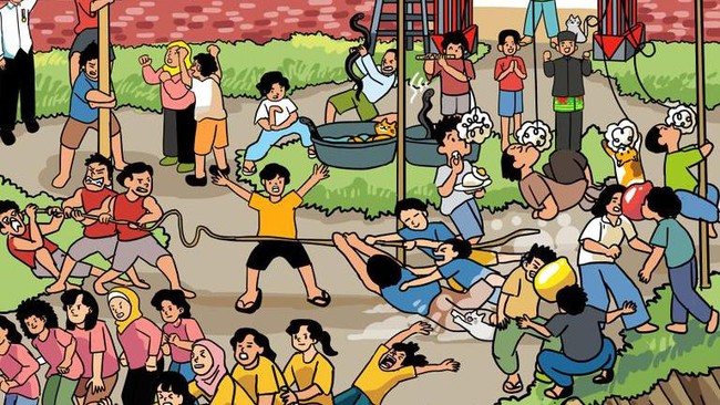Ada yang sedang ikut lomba makan kerupuk, berendam di ember, berpartisipasi di lomba tarik tambang, dan satu lagi sebagai penonton saja. Hal ini pun tidak luput dari pandangan netizen.