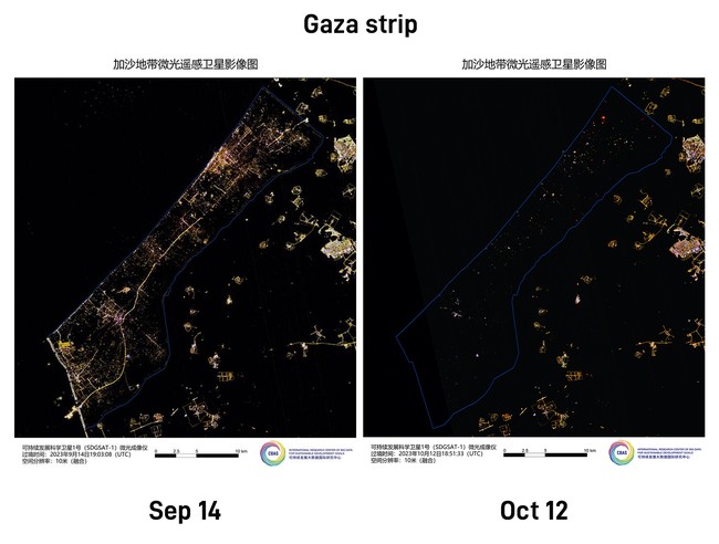 Gambar satelit jalur Gaza yang diambil sekitar pukul 10 malam waktu setempat di 14 September menggunakan instrumen pencitraan cahaya redup dari satelit SDG Center milik China, menunjukkan sebelum konflik Israel dan Hamas, wilayah itu cukup terang dan mencerminkan tingginya kepadatan.