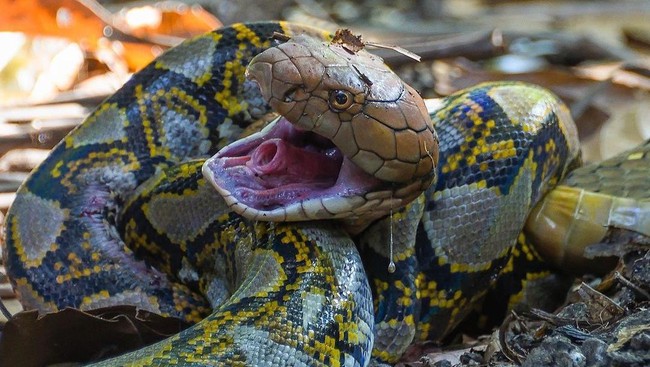 Pemandangan yang dilihat selanjutnya memang mencengangkan. Seekor ular king kobra sepanjang 5 meter tengah bergulat dengan piton berukuran 3 meter di semak-semak.