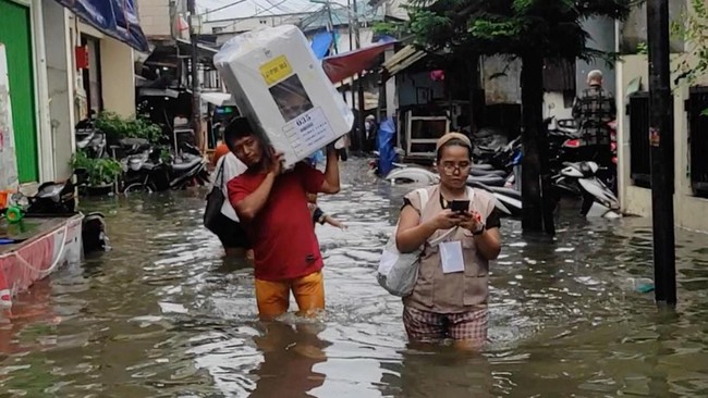 Sejumlah wilayah di DKI Jakarta dilanda banjir hari ini, Rabu (14/2/2024). Kondisi ini cukup menyulitkan para pemilih yang akan ke Tempat Pemungutan Suara (TPS) untuk menyalurkan hak suara mereka. Situasi tersebut ramai dilaporkan sejak pagi.