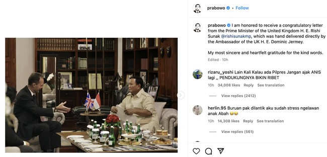Dalam postingan terbaru di Instagram, tampak Prabowo menerima kunjungan dari Duta Besar Kerajaan Inggris, H.E Dominc Jermey. Sang Dubes memberikan surat ucapan selamat dari Perdana Menteri Inggris, Rishi Sunak.