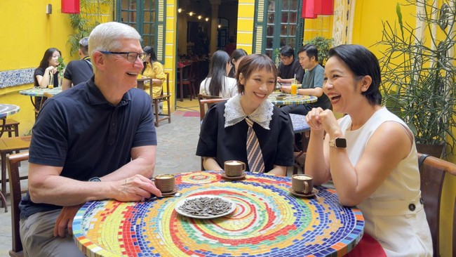 Selain itu, Tim Cook sempat ngopi bareng musisi Vietnam, My Linh dan My Anh. Dia pun sempat bertemu content creator Duy Shen di Danau Kiem Lake.