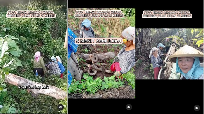 Sebuah video viral memperlihatkan ibu-ibu menarik ular yang mereka temukan bersembunyi di semak-semak desaunan. "POV: Emak2 Manado Ketika Bertemu Ular Piton di Kebun," caption video tersebut.