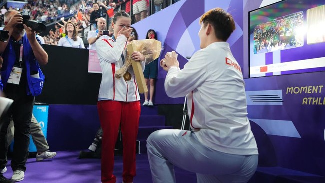 Momen atlet bulutangkis China Huang Yaqiong dilamar oleh Liu Yuchen usai memenangkan medali emas Olimpiade 2024 viral di media sosial. Netizen pun ikut gemas melihat momen yang romantis ini.