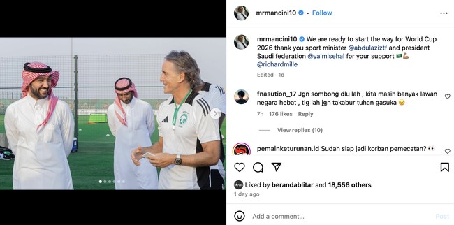Instagram pelatih asal Italia itu yang beralamat di @mrmancini10 pun ramai dengan komentar dari netizen asal Indonesia. Sebagian dari mereka melontarkan beragam komentar candaan untuknya.