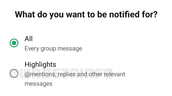 Dari tangkapan layar yang beredar, terlihat kini pada fitur mute pengguna bisa memilih untuk tetap mendapat notifikasi "Higlights" dari group chat. Maksudnya, pengguna tetap bisa mendapat notifikasi dari pesan yang me-mention mereka menggunakan "@", membalas pesan mereka, atau pesan relevan lainnya.