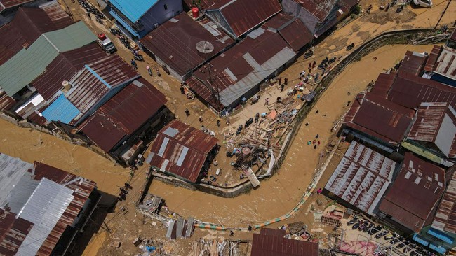 Foto udara salah satu lokasi yang terdampak banjir bandang akibat luapan Kali Lasolo di Kendari, Sulawesi Tenggara, Kamis (7/3/2024). Pihak BPBD Kota Kendari belum mengidentifikasi jumlah rumah yang rusak akibat banjir bandang. ANTARA FOTO/Andry Denisah/YU/tom. Foto: ANTARA FOTO/Andry Denisah