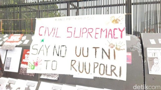 Akun @AlexanderOscar5 menulis, "Ini sudah keterlaluan, Polisi juga melakukan KEJAHATAN terhadap KEMANUSIAAN, menghalangi Tim Medis untuk membantu para pendemo yang terluka karena pemukulan dari tindakan represif Polisi itu sendiri," disertai tagar #CabutUUTNI dan #TolakRUUPolri.