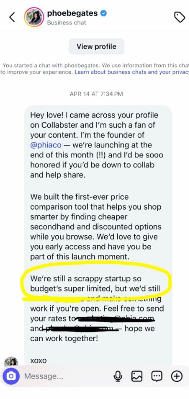 "Hai sayang! Aku menemukan profilmu di Collabstr dan aku sangat menyukai kontenmu. Aku pendiri @phiaco - kami akan diluncurkan akhir bulan ini (!!) dan aku akan sangat merasa terhormat jika kamu bersedia berkolaborasi dan membantu mempromosikannya," ujar Phoebe.