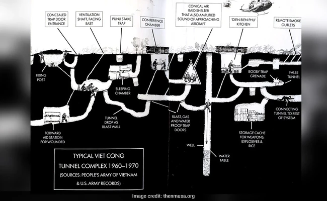 Diagram salah satu terowongan menunjukkan canggihnya jaringan sumur, sistem air, tempat penyimpanan, dan jebakan maut di terowongan semacam itu. Sudah dibom berulangkali tapi tetap sulit dihancurkan, AS akhirnya mengerahkan pasukan ke dalamnya untuk berperang langsung.