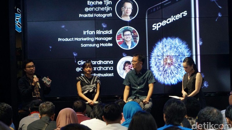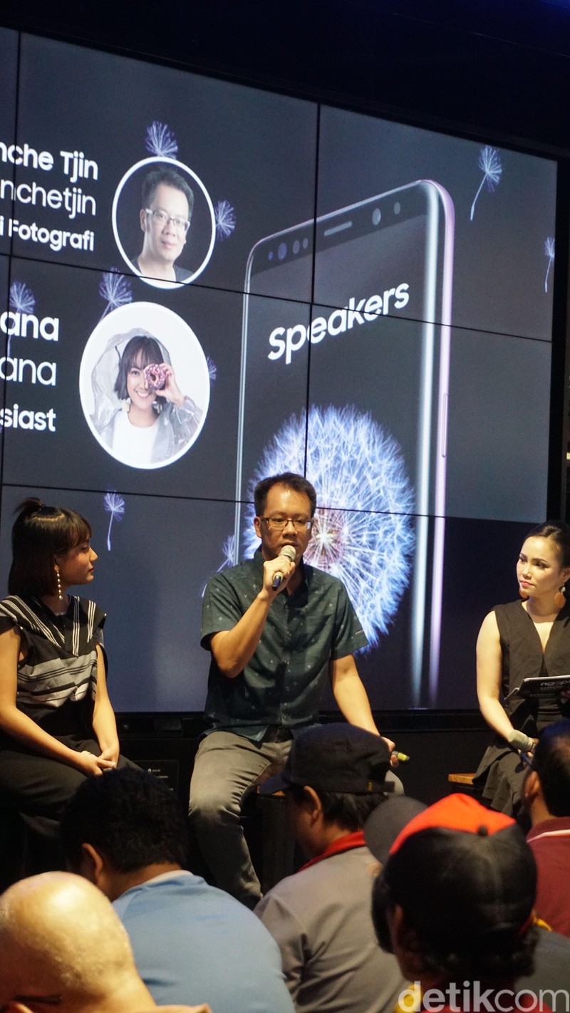 Enche Tjin yang merupakan fotografer profesional pada acara tersebut memberikan tips dan pengalaman serta hasil jepretannya menggunakan Samsung Galaxy S9. Ia mengatakan bahwa Samsung menghadirkan banyak fitur pada kamera di ponselnya, seperti peningkatan kemampuan dalam kondisi low light maupun slow motion yang dihadirkan pada Galaxy S9 dan S9+. (Foto: detikcom)