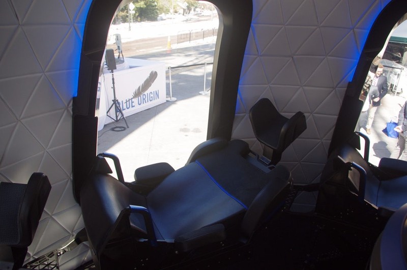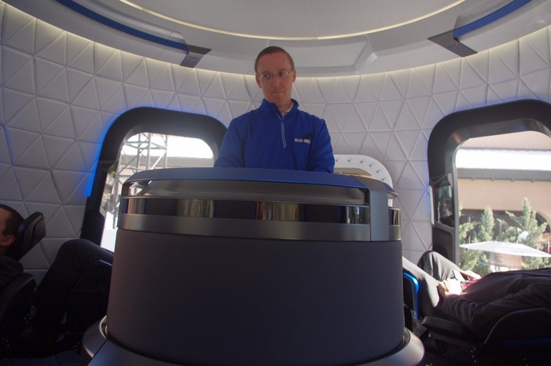 Salah satu kru Blue Origin menjelaskan interior dan fungsi kapsul. (Foto: Michael Franco/New Atlas)