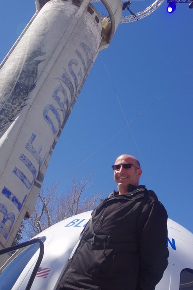 Berfoto di antara kapsul Boeing Starliner dan roket New Shepard (Foto: Michael Franco/New Atlas)