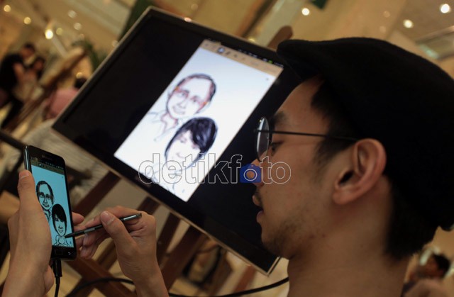 Seniman membuat karikatur pengunjung mall Plaza Senayan menggunakan Samsung Galaxy Note, Jakarta, Sabtu (10/3/2012). Pengunjung yang mengunjungi stand Samsung tersebut dilukis karikaturnya secara gratis menggunakan Samsung Galaxy Note.