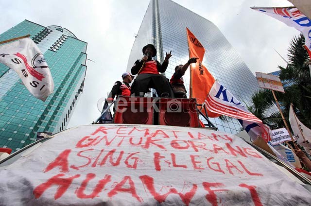 Kantor perwakilan Huawei di Indonesia kembali didemo puluhan buruh, Senin (4/3/2013). Mereka menduga, Huawei Indonesia masih mempekerjakan tenaga kerja asing tanpa dokumen resmi (ilegal).