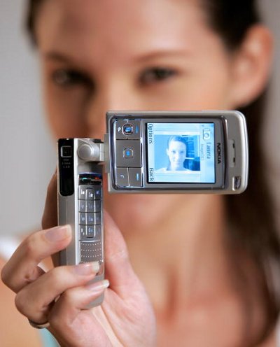 Seorang model memamerkan Nokia 7600 di New Delhi tahun 2004. Ponsel ini punya kapabilitas 3G, kamera, pemutar musik dan dikemas dalam desain menawan.