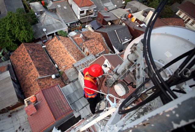 Teknisi melakukan perawatan pemancar Base Transceiver Station (BTS) 4G milik PT Telkomsel di Jakarta, Rabu (28/10/205). Telkomsel terus menambah cakupan dan meningkatkan kualitas jaringan 4G LTE di Indonesia.