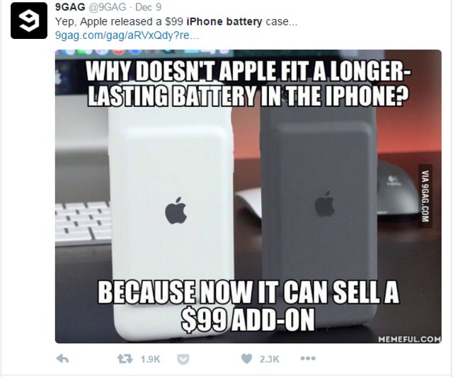 Apple merilis casing yang ada baterainya untuk iPhone bernama Smart Battery Case. Desainnya yang berpunuk dianggap menggelikan dan menjadi sasaran guyonan berbagai pihak.