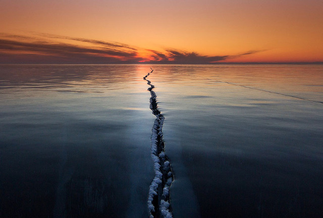 Sebuah fenomena alam di Rusia yang menakjubkan terjadi di Danau Baikal setiap tahun selama bulan Maret. Pergeseran suhu, angin, es, dan sinar matahari menyebabkan permukaan danau beku retak. (kredit foto: National Geographic/Alexey Trofimov)
