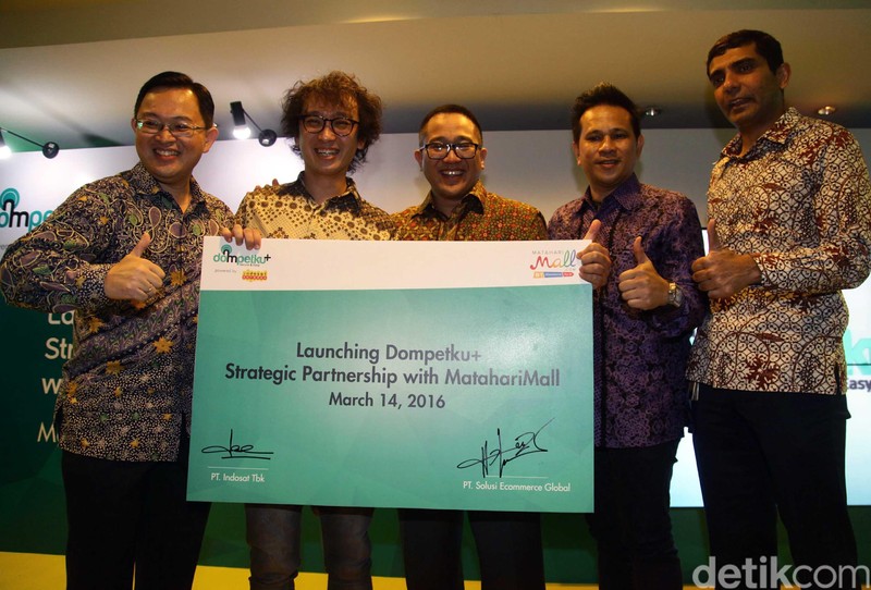 President Director & CEO Indosat Ooredoo (dua dari kanan) Alexander Rusli, Chief New Business & Innovation Officer Indosat Ooredoo Prashant Gokarn, Group Head Mobile Financial Services Indosat Ooredoo Randy Pangalila, CEO MatahariMall Hadi Wenas dan Komisaris MatahariMall Adrian Suherman saat menandatangani nota kerja sama.