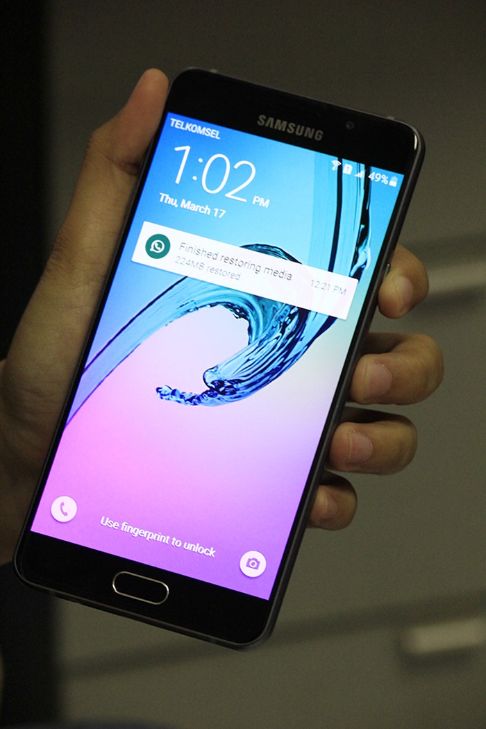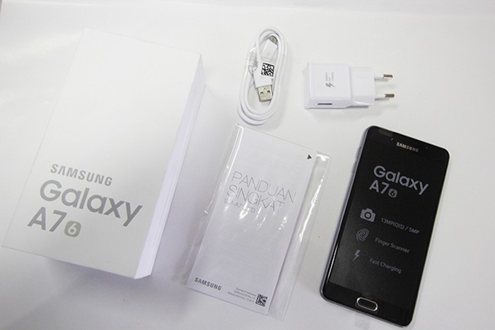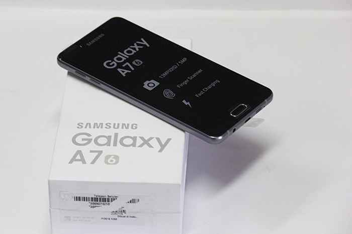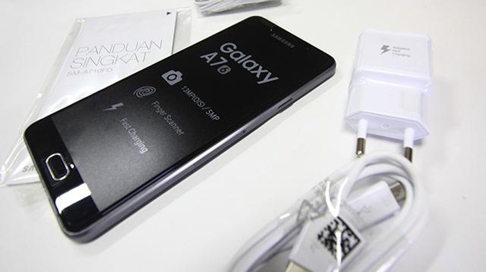 Di dalam boks putih ini, tersembunyi ponsel Galaxy A7 yang kebetulan unit yang kami review berwarna hitam. Foto: Irna Prihandini