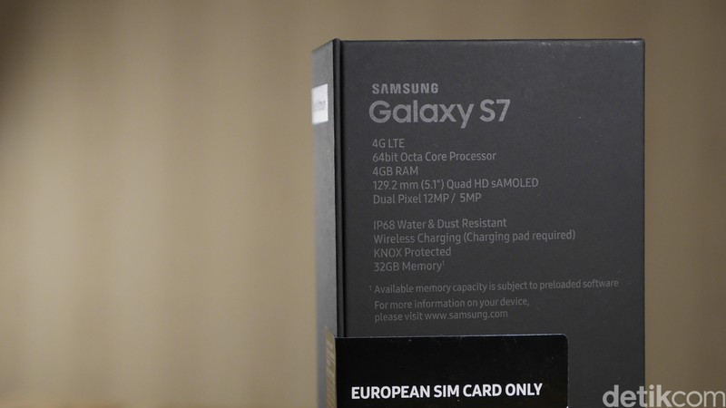 Boks penjualan Galaxy S7 terlihat mewah dengan warna dasar hitam, dengan tulisan Samsung Galaxy berwarna perak. Foto: detikINET - Anggoro Suryo Jati
