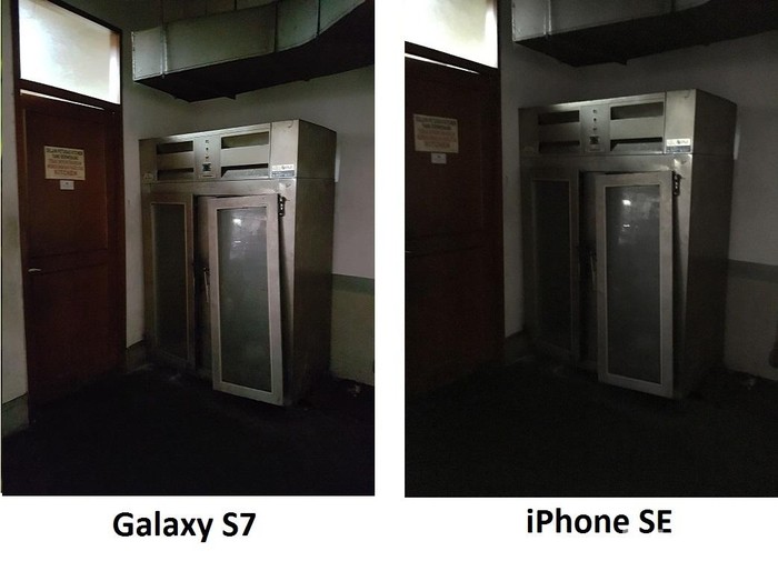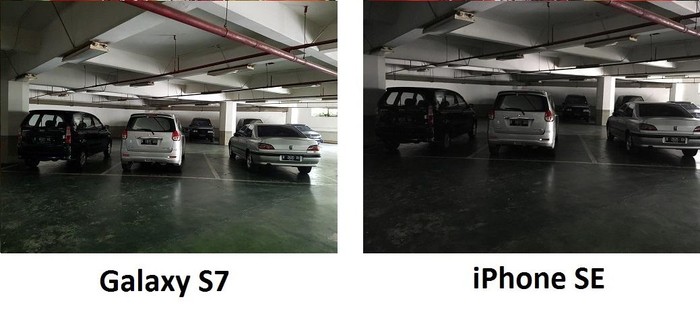 Ketika di basement, jepretan Galaxy S7 lebih terang. Sementara iPhone SE kurang dan terdapat noise. Foto: detikINET/afr