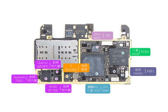 Di mainboard Huawei P9 tertanam prosesor Kirin 955, memori internal 64 GB, chip audio Hi-Fi, dan lain-lain. Foto: Istimewa