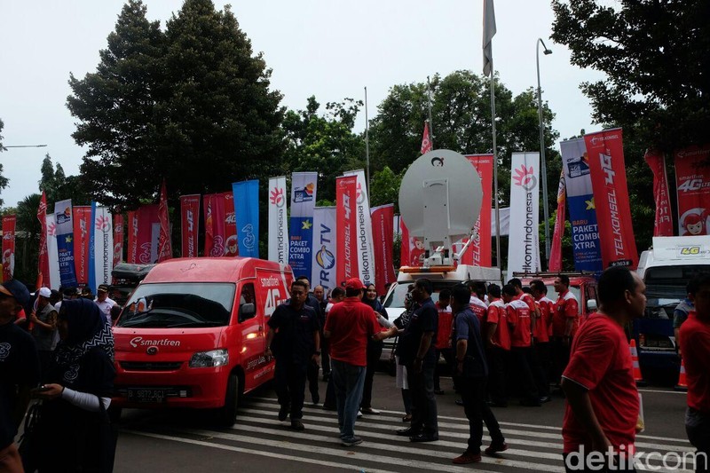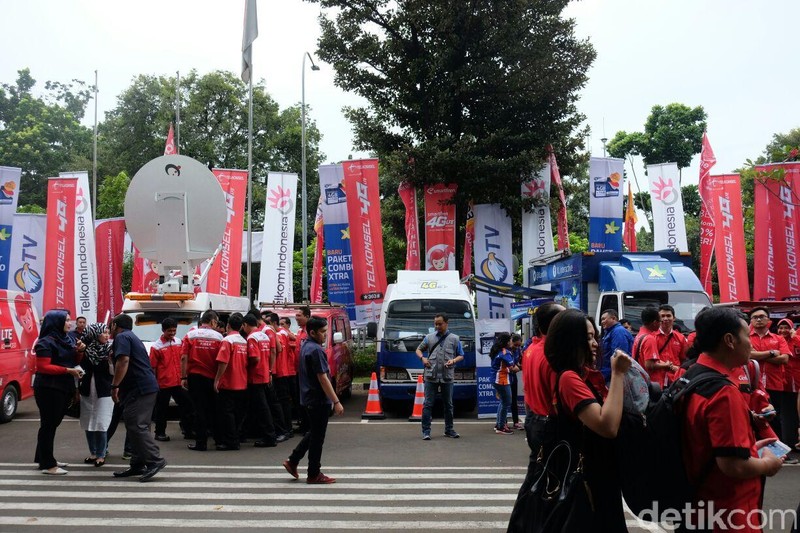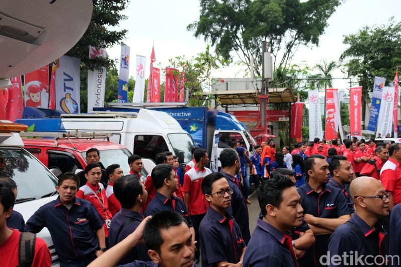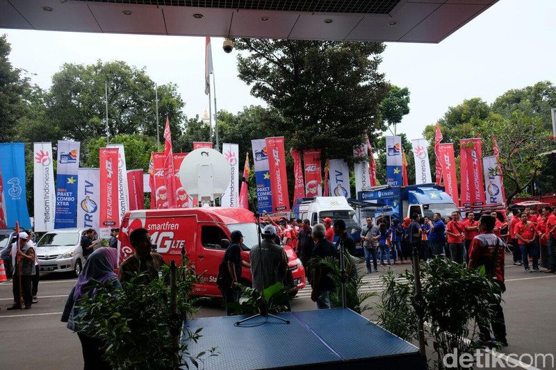 Mereka datang bukan untuk berdemo, melainkan mengikuti apel dalam rangka pengecekan kesiapan jaringan seluler guna menyambut mudik yang dikomandoi Menkominfo Rudiantara. Foto: detikINET/Ardhi Suryadhi