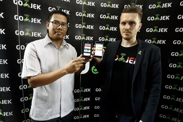 Chief Marketing Officer Go-Jek Indonesia, Piotr Jakubowski, bersama Chief Executive Officer Rumah Zakat, Nur Efendi, saat memperkenalkan aplikasi progam spesial "Ramadhan Bersama Go-Jek", di Jakarta. Pool/dok. Go-Jek.