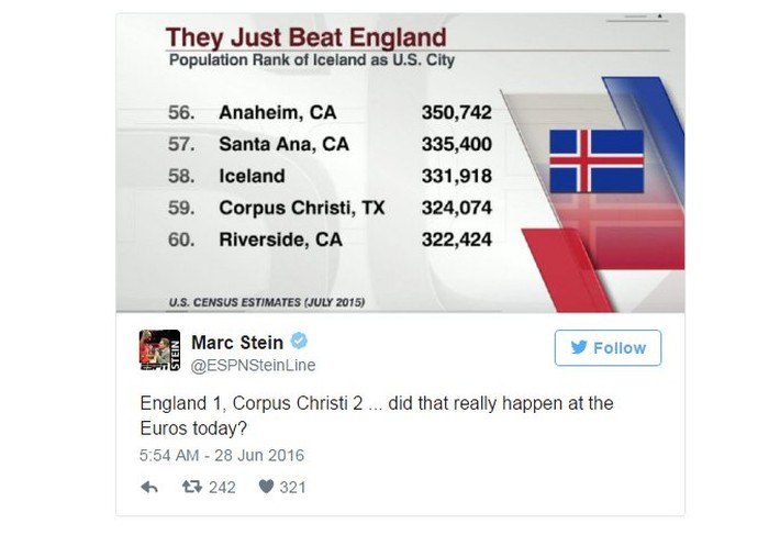 Islandia yang penduduknya ratusan ribu orang, kalah dari penduduk kota di Amerika Serikat, sukses menaklukkan Inggris yang jauh lebih diunggulkan. Foto: Istimewa