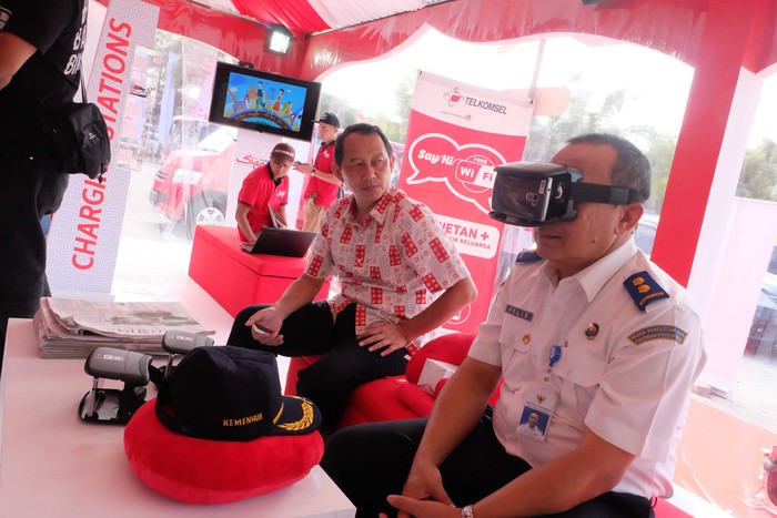 Nah, ini salah satu pojok hiburan yang bisa dicoba pemudik, virtual reality! Foto: Telkomsel