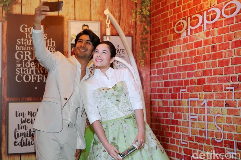 Aksi Reza Rahadian dan Chelsea Islan memotret selfie dengan Oppo F1s. Foto: detikINET/Ari Saputra