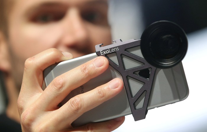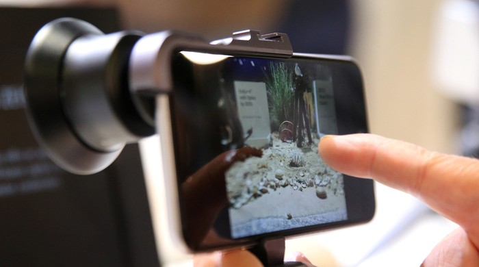 Dari booth Zeiss, mereka menawarkan lensa tambahan untuk smartphone yang dinamai ExoLens. Foto: Reuters