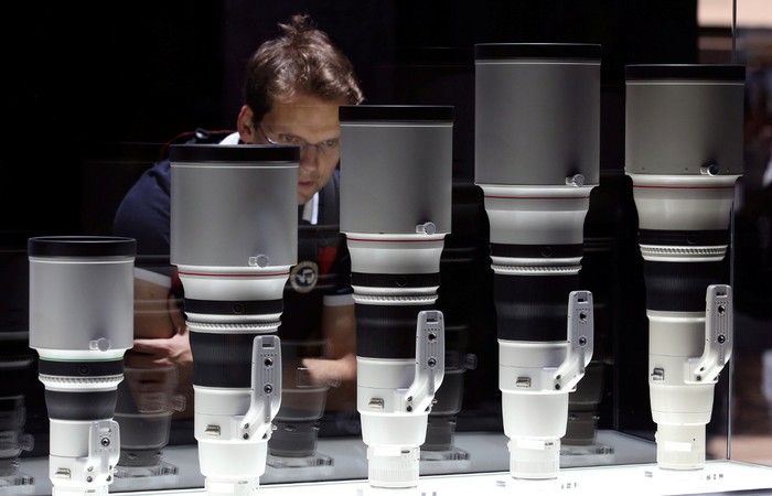 Di booth Canon pengunjung bisa melihat deretan lensa tele. Foto: Reuters