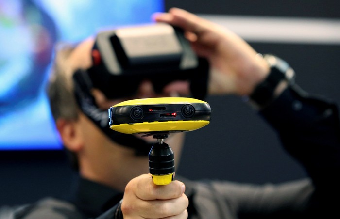 Masuk ke booth Vuze, salah satu pengunjung Photokina menjajal kamera 3D 360. Β Foto: Reuters