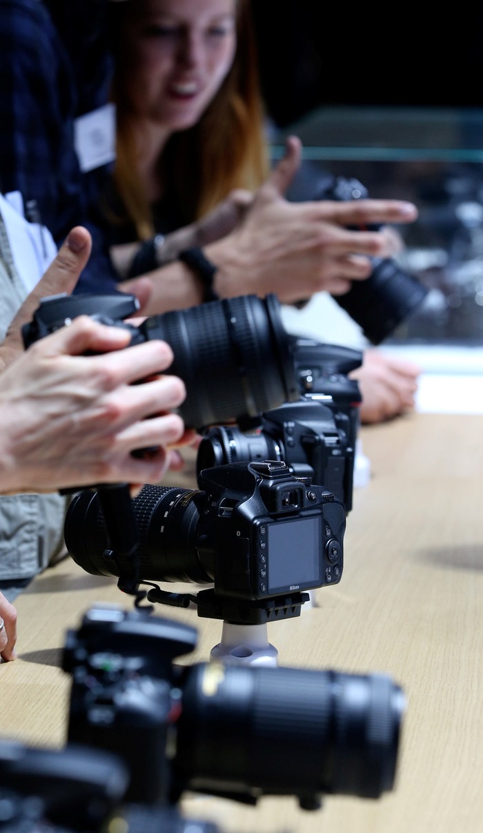 Beberapa pengunjung Photokina mencicipi deretan kamera DSLR terbaru milik Nikon. Β Foto: Reuters
