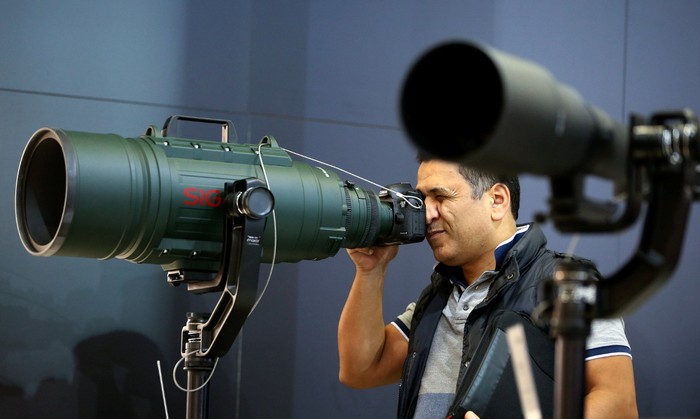 Selain di booth Canon, Sigma juga menghadirkan deretan lensa tele. Foto: Reuters