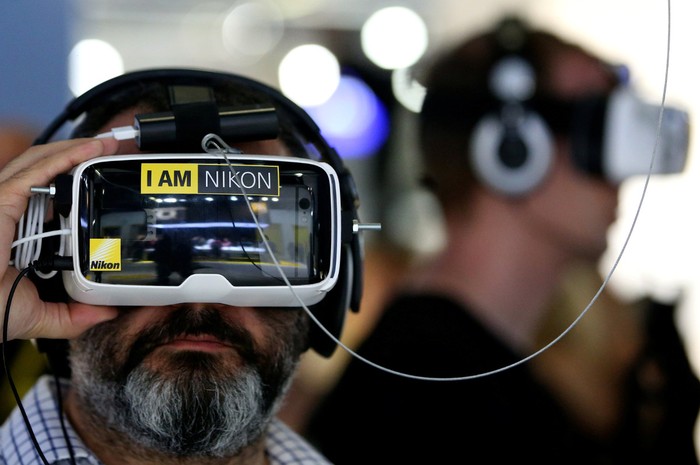 Pengunjung yang sedang menonton presentasi acara Nikon dengan Virtual Reality Foto: Reuters