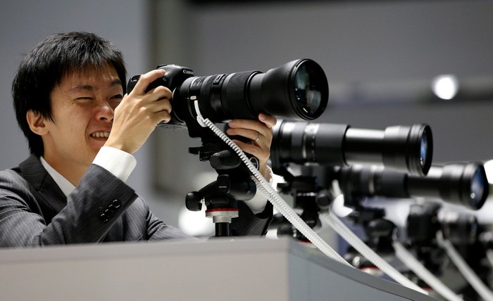 Masuk ke booth Tamron, pengunjung dapat mencoba lensa kameranya. Β Foto: Reuters