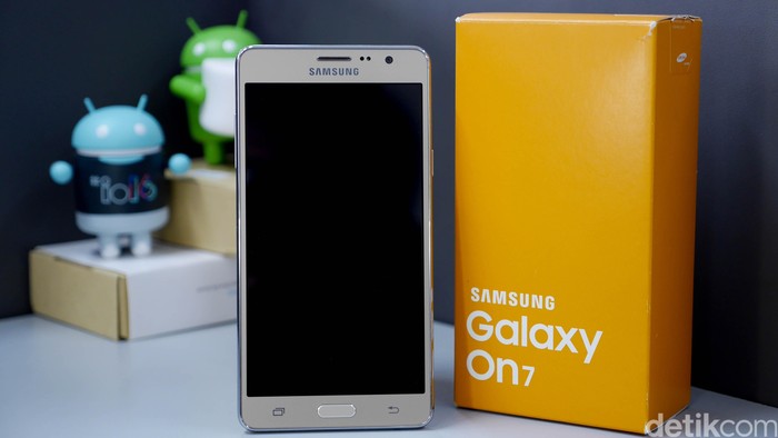Galaxy On7 yang detikINET unboxing berwarna emas, dengan casing belakang bertekstur layaknya kulit jeruk.Β Foto: detikINET - Anggoro Suryo Jati