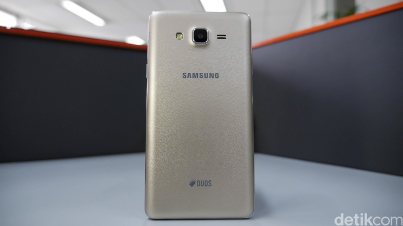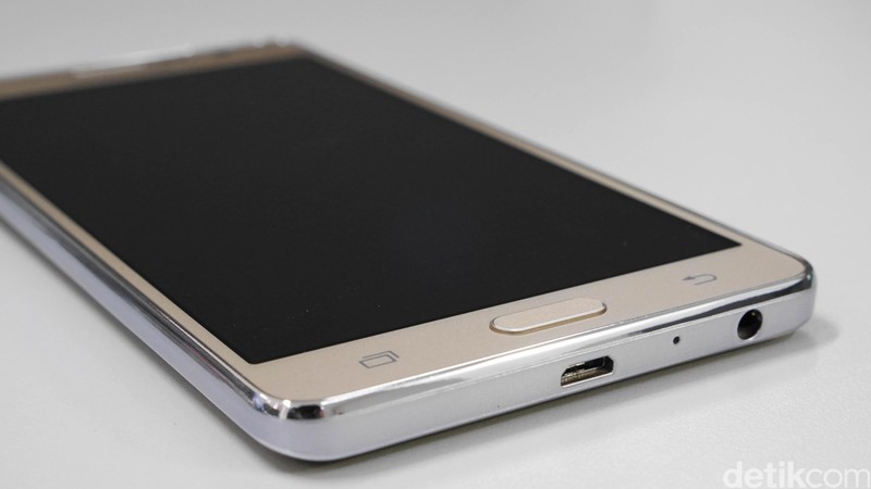Galaxy On7 yang detikINET unboxing berwarna emas, dengan casing belakang bertekstur layaknya kulit jeruk. Foto: detikINET - Anggoro Suryo Jati