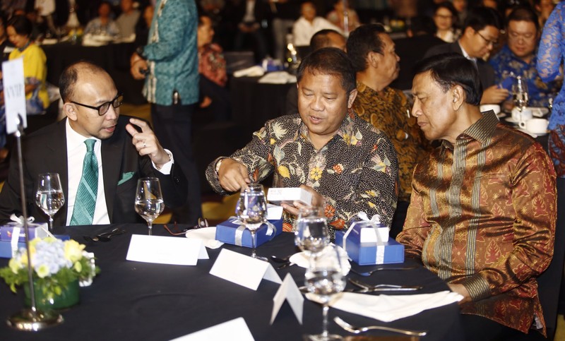 Mantan Menteri Keuangan Chatib Basri -- yang sekarang menjabat Komisaris Utama XL Axiata Foto -- sedang berbincang dengan Menkominfo Rudiantara dan Menkopolhukam Wiranto. detikINET/Rachman Hariyanto