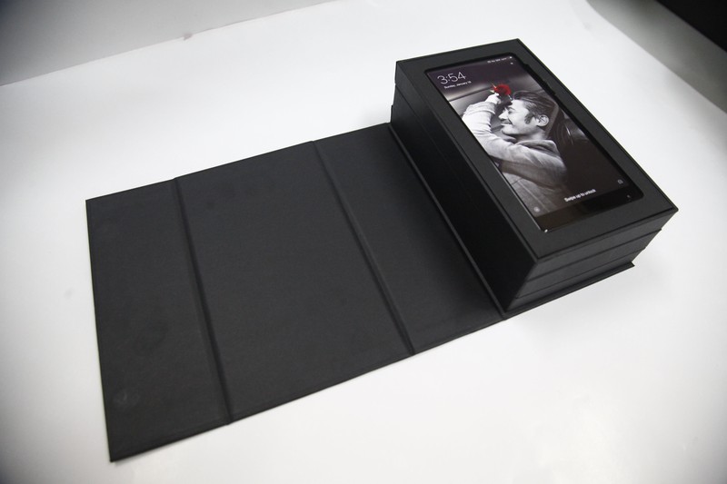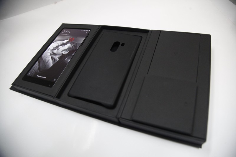 Mi Mix hadir dengan kotak kemasan berwarna hitam legam yang dibungkus dengan karton berwarna hitam. Di bagian belakang tertulis informasi mengenai RAM yang diusung. Foto: Muhammad Ridho