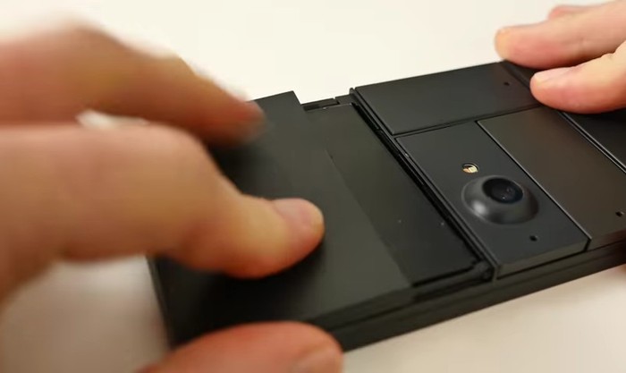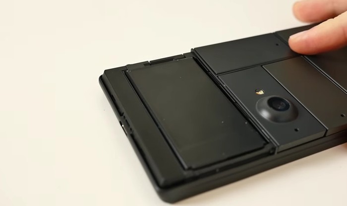 Kalau melihat prototipenya, tampak ada tiga modul yang bisa dibuka-pasang. Namun Phandroid mengatakan pihaknya hanya memegang satu modul, yakni kamera. Sementara itu dua modul sisanya merupakan modul dummy. Foto: Istimewa/phandroid