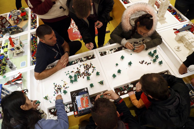 Tampak pengunjung yang ditemani karyawan Lego saat menggabung-gabungkan berbagai kepingan lego. Foto: Reuters/Stefan Wermuth