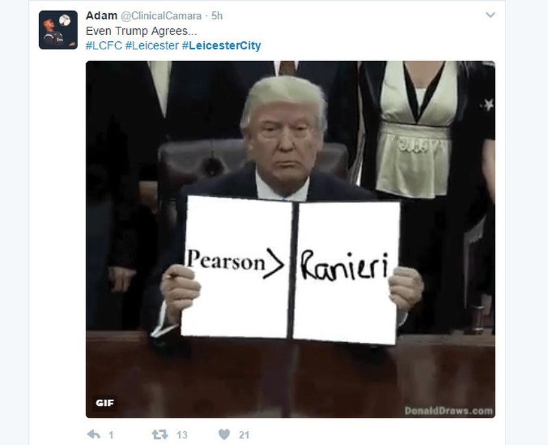 Netizen ini meminjam foto Donald Trump yang berharap pelatih Leicester Claudio Ranieri segera diganti kandidat kuat Nigel Pearson. Foto: Istimewa